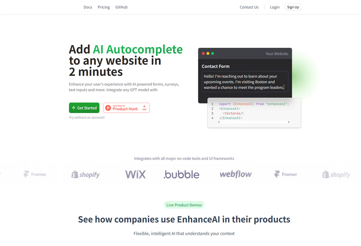 EnhanceAI是一个AI智能自动补全代码与功能集成平台,EnhanceAI主要通过提供AI驱动的表单、调查和文本输入等功能,利用GPT模型的强大语言生成能力,为用户提供智能补全和预测。