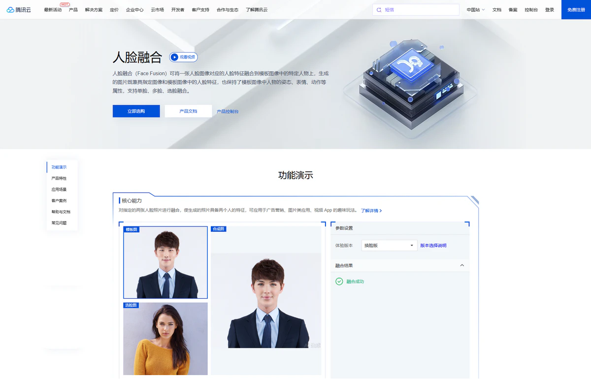 - 使用API Explorer工具可以在线调用API接口,快速体验人脸融合功能。