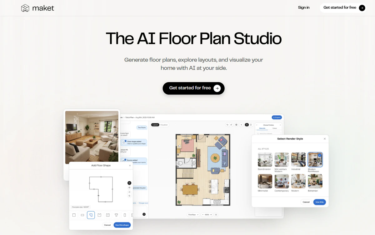- ai创意设计ai室内设计ai建筑设计ai设计服务ai设计ai设计工具Maket.aiMaket.ai是面向住宅建筑领域的AI生成式设计平台,主打“文本/参数→户型平面图→3D渲染”全链路,2020年成立、2023年正式上线,已获340万加元种子轮融资,用户超100万,生成方案超百万套Maket。