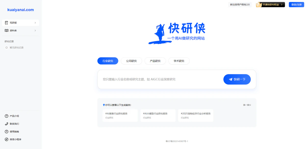 AI快研侠是基于人工智能的一键生成专业研究报告的工具平台,定位为"一个用AI做研究的网站"。