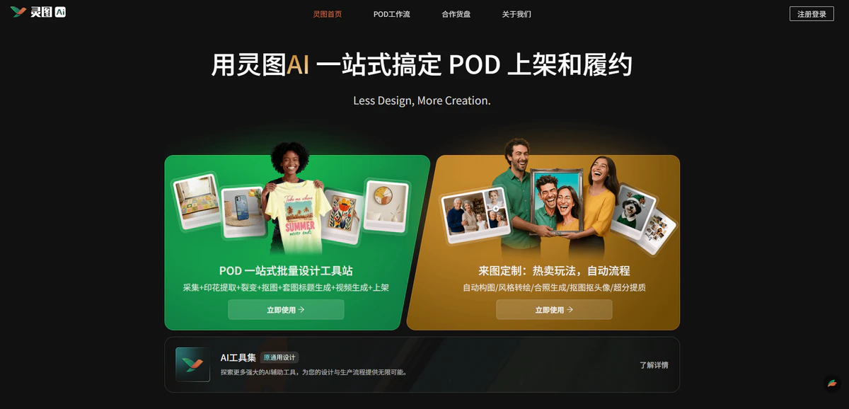 灵图AI(LingVisions)是AI辅助设计平台,专注于为设计师、插画师、电商从业者等创意人群提供高效的AI设计工具,使命是"帮助创作者减少繁琐的设计过程,专注于创作本身"。