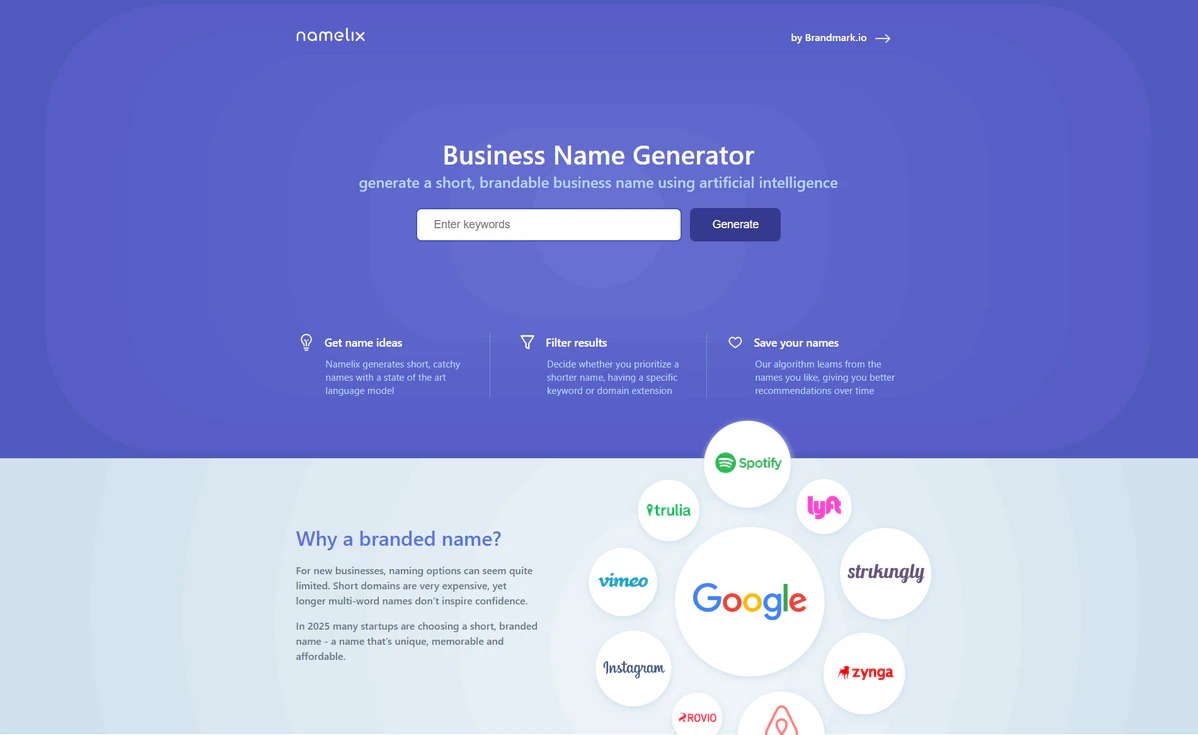 Namelix是一款基于人工智能的商业名称生成工具,由Brandmark.io开发,专注于为初创企业、品牌项目、产品等提供简短、易记且具有品牌感的名称建议。以下是关于Namelix的详细介绍: